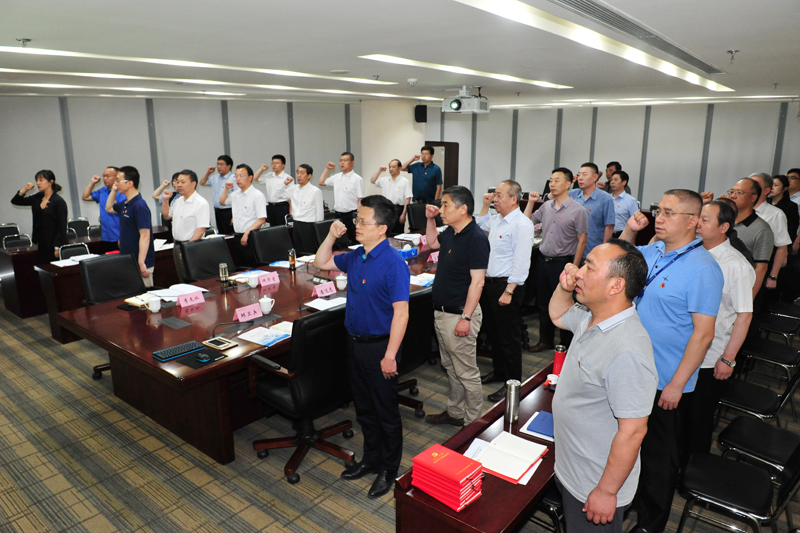 会议首先举行“重温入党誓词,不忘入党初心”主题教育启动仪式。李义岭同志带领全体参会党员面向党旗,庄严宣誓。在铿锵有力的誓言中,际华集团“不忘初心、牢记使命”主题教育正式拉开序幕。