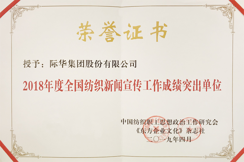 4月18日,际华集团在2019年全国纺织企业宣传教育报刊(网站)理事会暨《东方企业文化》特约记者工作会上,被授予“2018年度全国纺织企业新闻宣传工作成绩突出单位”。