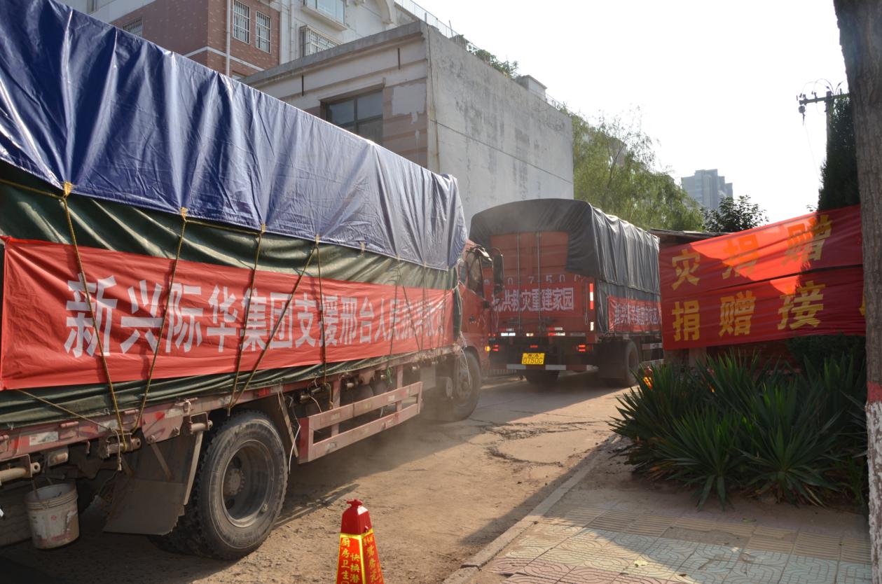 2016年7月25日,满载着新兴际华八万员工深情厚意的救灾物资车队从祖国各地开往邢台灾区。自2016年7月19日以来,河北省邢台地区连降暴雨,遭遇百年一遇的洪涝灾害,通往山区及开发区周边村庄的道路桥梁、通讯、电路中断,截止到7月23日9点,已造成邢台市境内死亡、失踪数十人,桥梁及大量房屋被冲毁。洪水给邢台地区造成严重损失。
