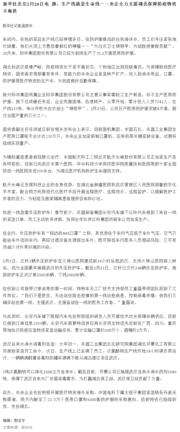 《新华社》生产线就是生命线——央企全力支援湖北保障防疫物资不断供