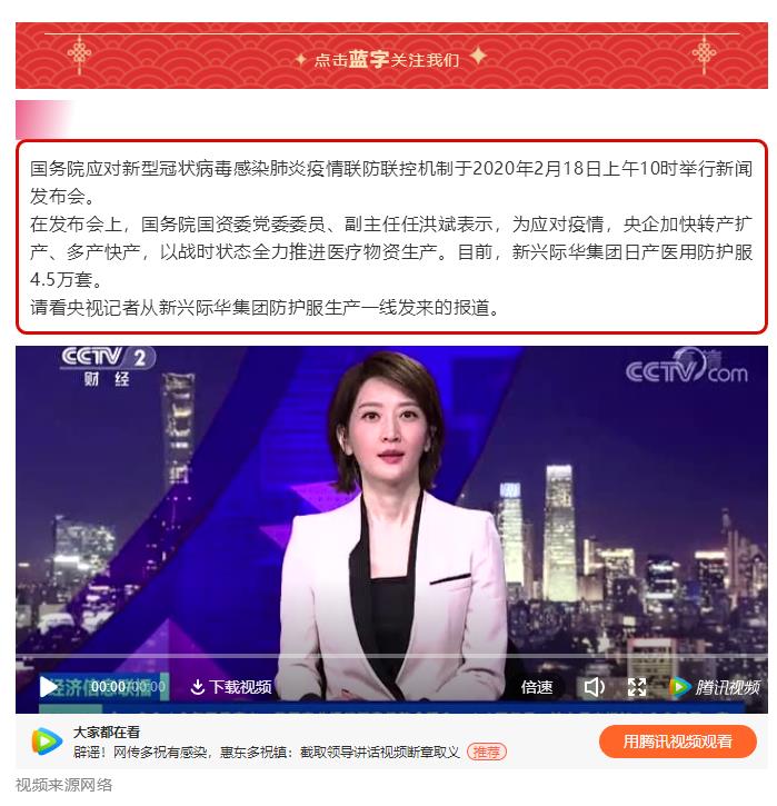 新兴际华集团抗疫防护保障再次登上《中央电视台》