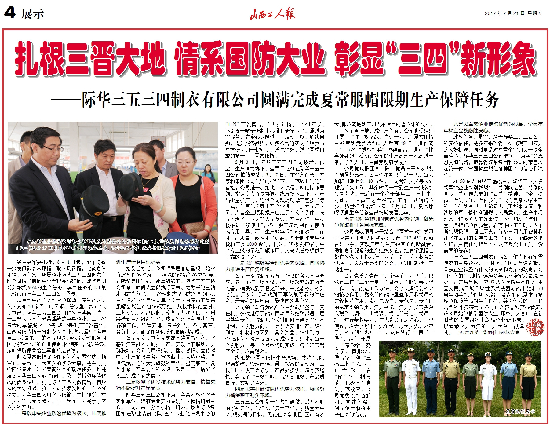 《山西工人报》扎根三晋大地 情系国防大业 彰显“三四”新形象——际华三五三四制衣有限公司圆满完成夏常服帽限期生产保障任务