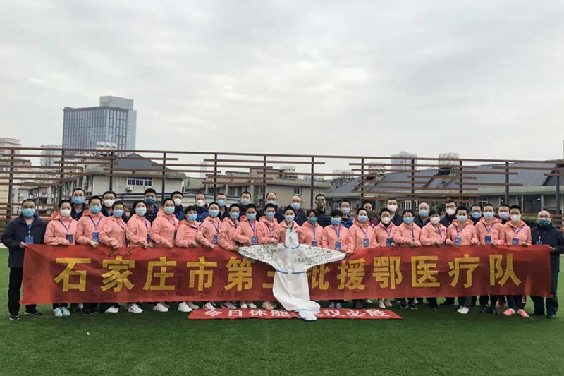 3月11日下午,石家庄市第三批援鄂医疗队在湖北武汉所住宾馆草坪上,举行了简单的签名合影仪式,40名队员在际华3502公司所生产的防护服上写下了自己的名字。
