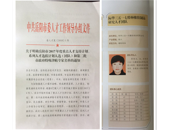 近日,在岳阳市召开的“2018年全市巴陵人才工程推进大会”上,际华3517公司特种橡胶制品研究人才团队入选科技创新创业人才团队,总工程师蒋绮云入选“巾帼英才”,高级工程师周江帆入选“巴陵卓越工程师”。