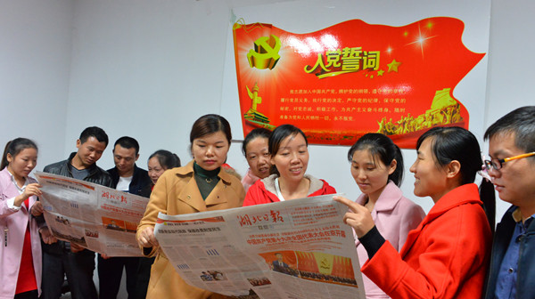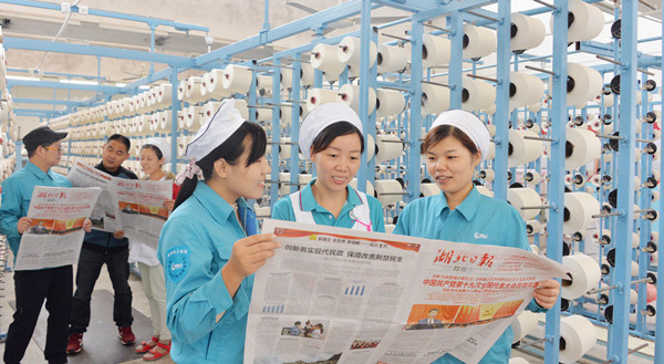 10月20日,际华3509公司青年职工争相传阅党报,学习十九大精神,立足岗位奋发工作。