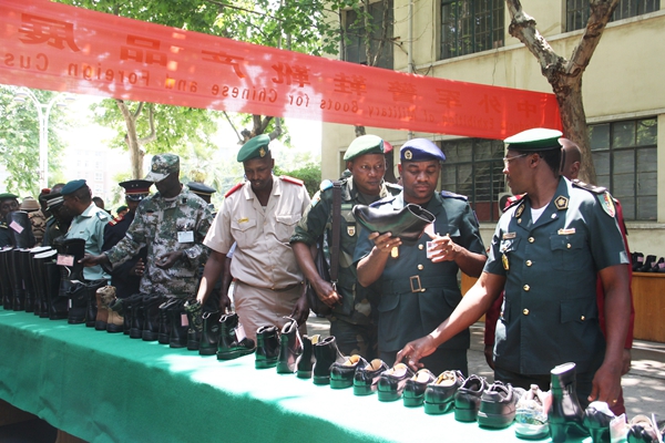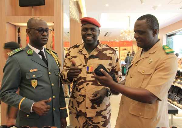 际华3515公司执行董事范子坤等企业高管及相关部门人员在办公楼前热烈欢迎,并同学院领导和全体留学生代表合影留念。随后,代表团一行兴致勃勃地观看了企业产品展台,参观了公司检测中心、生产车间、铁路专用线、强人国际馆、际华强人工业园。产品展示区装备齐全的中外军警靴,检测中心严格的产品质量检测流程,强人国际馆琳琅满目的时尚休闲产品,让留学生代表们惊叹不已,不时驻足观赏询问。在生产车间,一个来自非洲的女军官,看到科学规范的制鞋生产工序,用不熟练的中文赞叹到:中国工人很“牛”;在强人工业园,当解说员讲到:公司引进的是世界上最先进的德国德士马高智能自动化制鞋生产设备时,留学生代表们纷纷竖起大拇指,频频点头称赞。