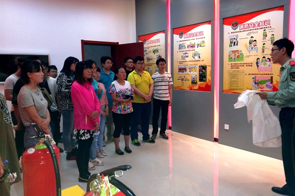 在消防知识展室,教官为大家详细介绍了干粉灭火器的操作使用方法和一般消防器械的功能及用途,并普及了安全消防知识和119火警的报警注意事项:应准确陈述起火地点、地址(或附近标志性建筑物)、起火部位、燃烧物质、有无被困人员、有无爆炸和毒气泄漏、火势情况等,最好派人到路口迎候消防车,以使消防队能够迅速整理信息直达火场进行救助。