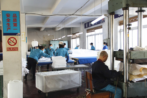 每天早上,管理人员与车间工人一样早早来到车间现场,以饱满的精神,认真的态度投入到生产任务中,他们按照所分配的工作,各负其责,两人组成一组,有的负责翻被角,有的负责叠被罩,有的负责装袋贴标签,有的负责打包……,分工明确、组织有序,现场呈现出一片热火朝天的劳动景象。虽然站一天很累,被罩的棉絮会引起呼吸不畅、咳嗽,但大家都没有一句怨言和牢骚,在看到自己叠好的整齐的被罩和打包好的一箱箱成品,都像是看到自己亲手完成的艺术品一样,疲惫的眼神里透露着快乐和满足。