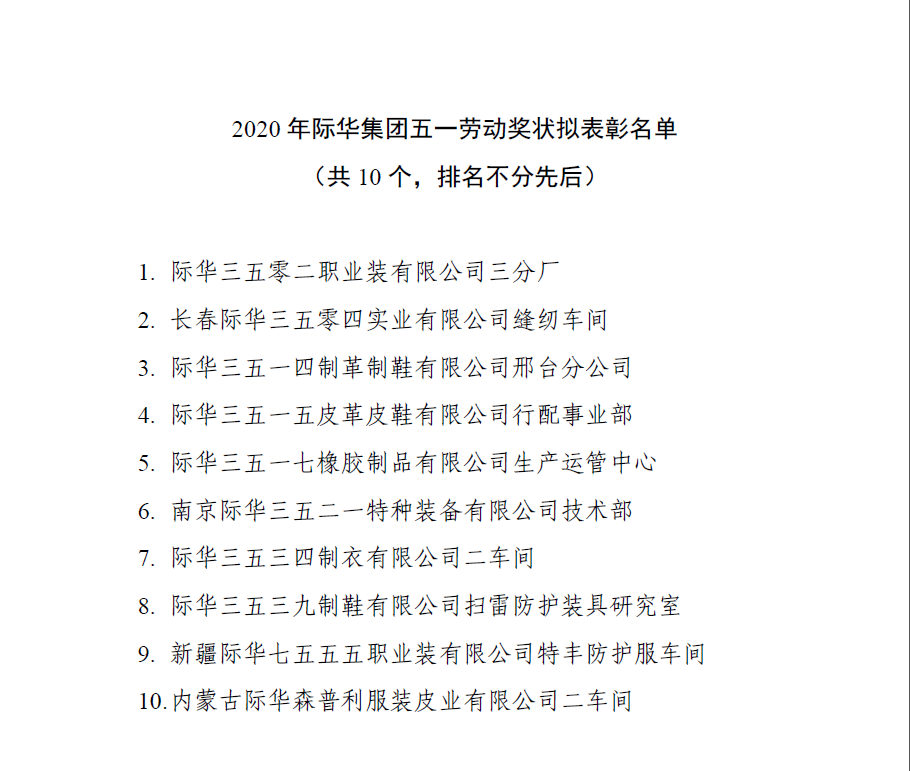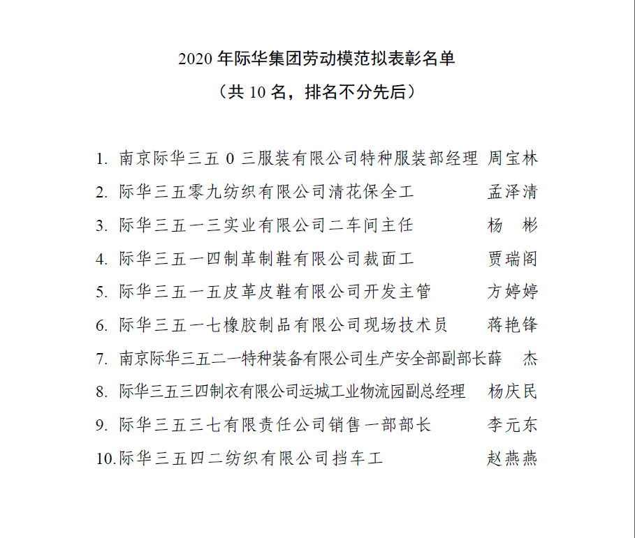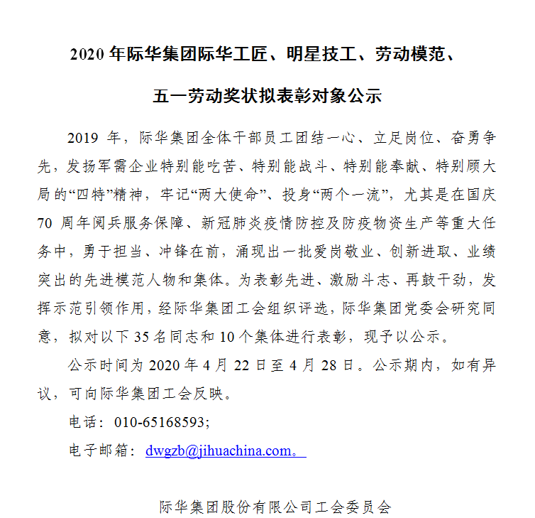 2020年际华集团际华工匠、明星技工、劳动模范、五一劳动奖状拟表彰对象公示