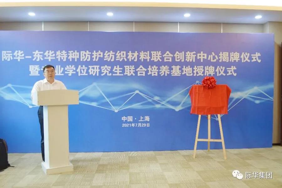 7月29日上午,“际华-东华特种防护纺织材料联合创新中心暨专业学位研究生培养基地”揭牌仪式在东华大学举行,新兴际华集团副总经理徐建华和东华大学校长、中国工程院院士俞建勇分别在揭牌仪式上致辞,际华集团党委副书记、总经理段银海和东华大学科学技术研究院院长丁彬分别代表双方揭牌。
