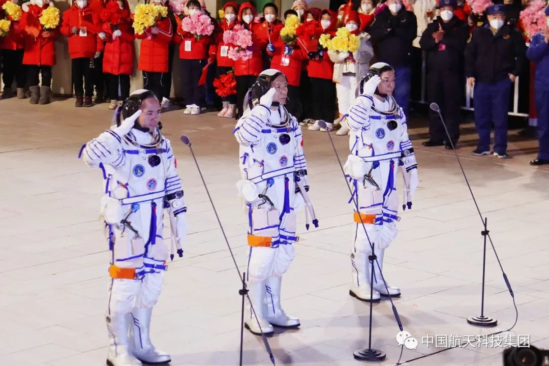 ▲ 神舟十五号航天员费俊龙(中)、邓清明(右)、张陆(左)出征(来源:张晓宁 摄)