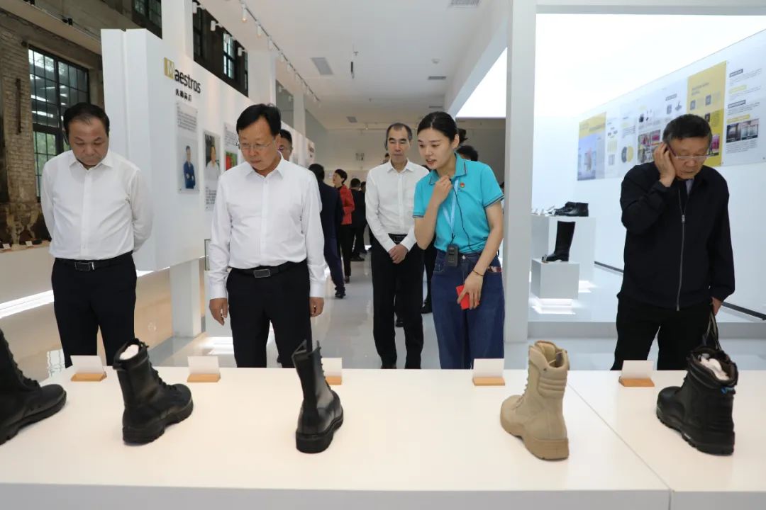 贾世瑞一行实地调研了3515公司新区智能生产线、艾思莱萨高端定制店,参观了际华皮革皮鞋研究院,详细了解了研究院的建设、定位和未来发展目标,着重查看了研究院检测中心、实景模拟测试中心。