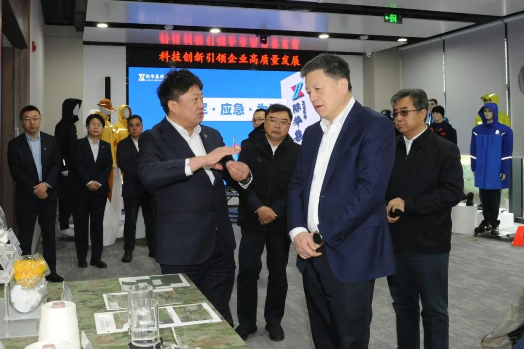 周群一行参观了际华股份科技展厅,了解企业在军需被装、应急保障和民用功能性产品研制等方面取得的最新成果。