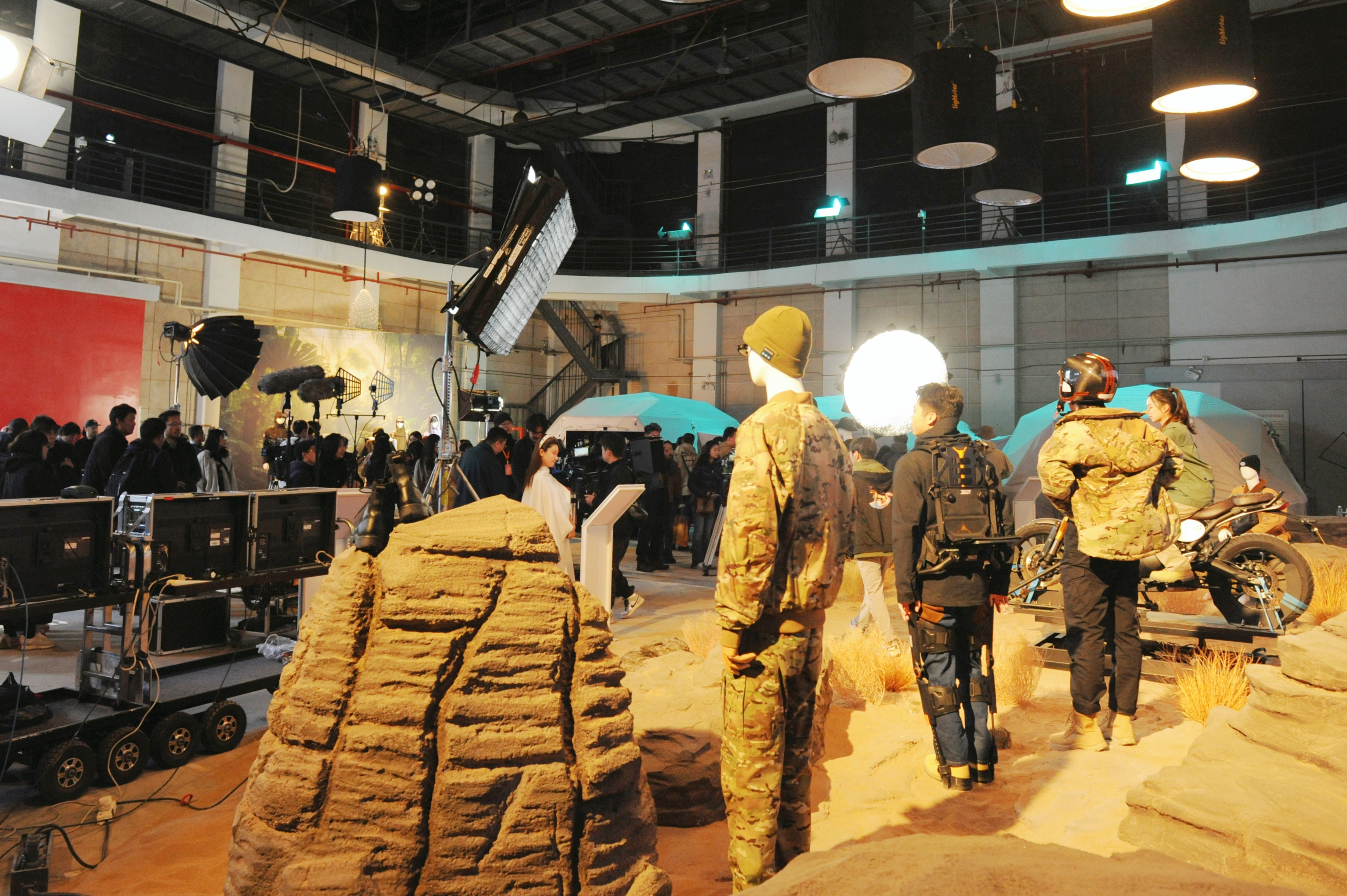 特展中精心复刻沙漠、降雪、降雨等户外拍摄环境,剧组帐篷区则再现影视后勤工作场景,让观众沉浸式感受际华军需科技转化产品在影视场景中的实际应用,让军需科技转化装备在光影中“活”了起来。