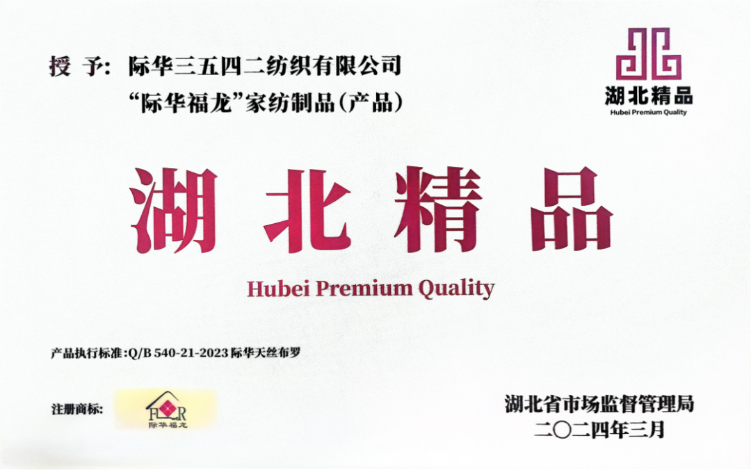 近日,湖北省政府副省长、党组成员盛阅春为获认定的“湖北精品”代表企业授牌。际华三五四二纺织有限公司的家纺产品凭借卓越的品质和创新的设计,获得了这一荣誉称号。“湖北精品”是指湖北省内市场主体生产、提供、建设的达到国内先进标准、质量稳定可靠、创新能力突出、社会信誉良好,并按照“‘湖北精品’认定管理办法”予以认定的产品、服务和工程。