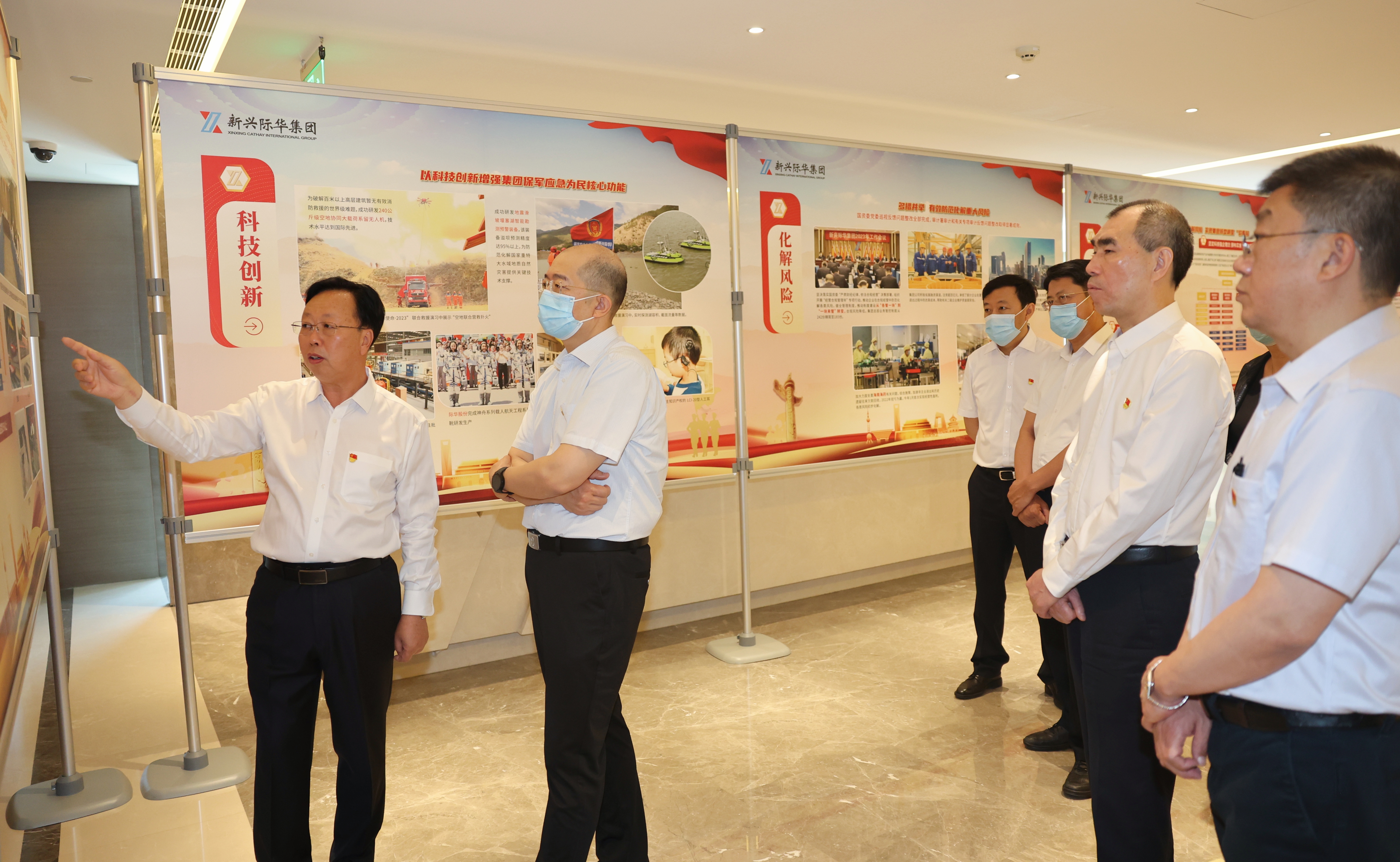 谭作钧一行参观了新兴际华集团关于主题教育、党的建设、改革发展、风险化解、科技创新、振兴工程等方面的展览。听取了集团公司党委书记、董事长贾世瑞工作汇报,并与集团总部部门、二级公司和基层党组织代表进行座谈,对近年来公司在党的建设、经营效益、资产处置、科技创新等方面工作给予肯定。
